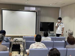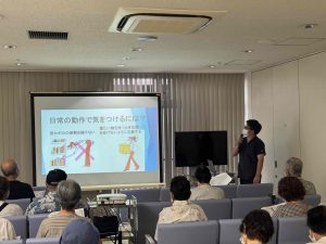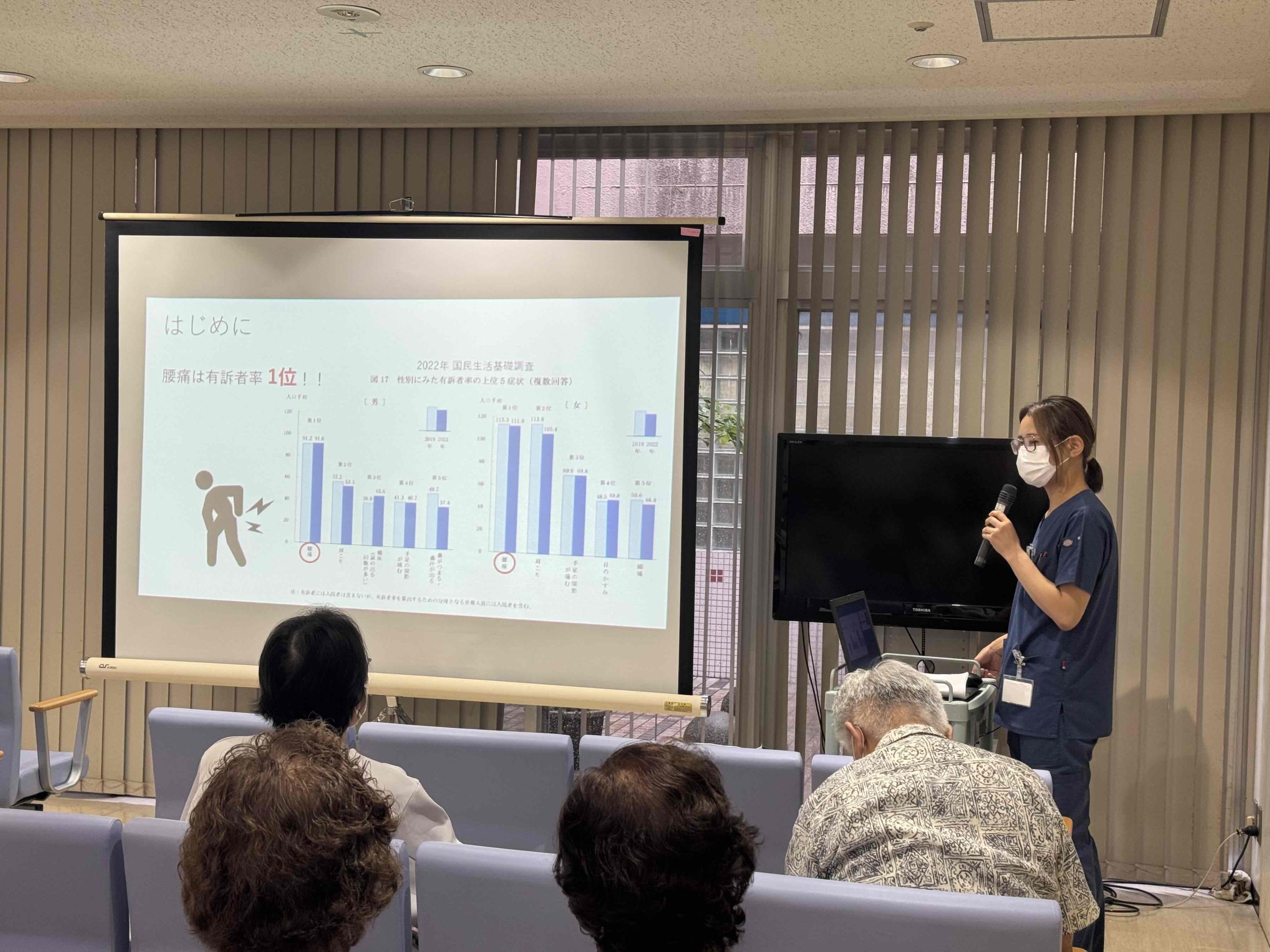 看護師が、①腰痛を予防するには?、②よい姿勢を保つには?、③日常の動作で気をつけるには?、④悪い姿勢の代表 、⑤腰の負担を減らす工夫、⑥自宅でできる腰痛予防、⑦腰によい運動などについて講演をしました。