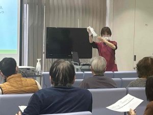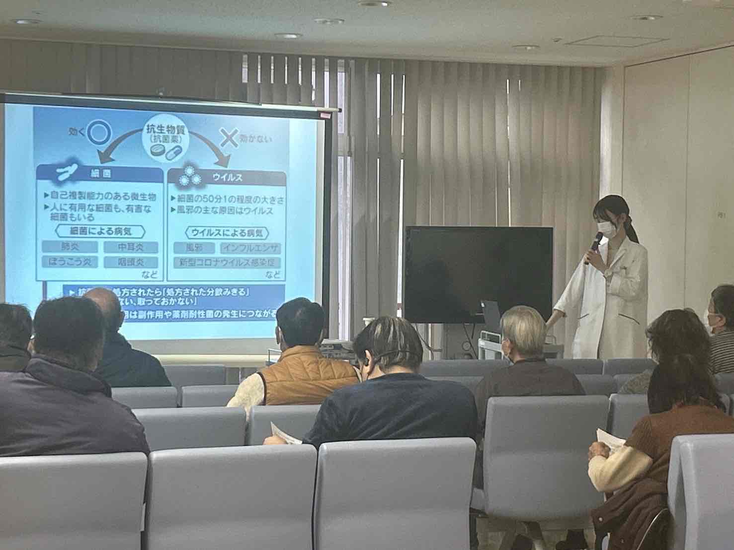 薬剤師が、①冬の感染症、②インフルエンザ治療薬の種類、③インフルエンザ治療薬の使い分け④インフルエンザワクチンの作り方、⑤ワクチンの効果発現はいつから?、⑥新しいインフルエンザワクチン、⑦ノロウイルスに感染した時の注意点などについて講演をしました。
