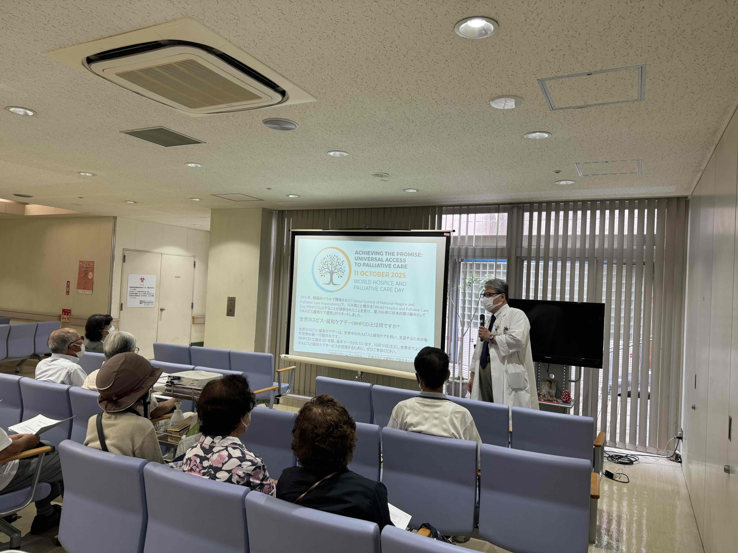 外科医師が ①2025年のWHPCDテーマ:約束の達成: 緩和ケアへの普遍的なアクセス②緩和ケアとは、③緩和ケアはいつでも受けられる、④「チームケア」のイメージ、⑤緩和ケアはいつでも受けられる。⑥緩和ケアの内容、⑦緩和ケアチーム、⑧緩和ケア病棟よくある質問などについて講演をしました。 |
