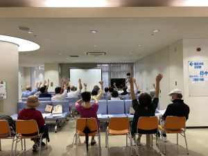 リハビリスタッフが、転倒予防のトレーニング、体操を行いました。 |