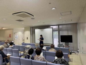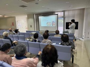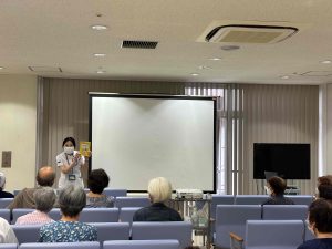 リハビリスタッフが、転倒と健康の関係ついて説明し、予防体操を行いました。 |