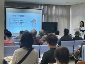 管理栄養士が、 ①認知症とは?、②症状、③記憶障害、④徘徊、⑤もの盗られ妄想、⑥家族はどうしたらいい?、⑦不眠、⑧心理症状、⑨リスクを下げる習慣などについて講演をしました。